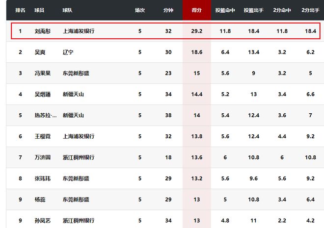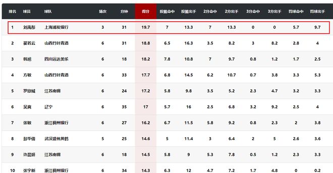 刘禹彤真的就像是女版奥尼尔统治了全锦赛。她带领上海女篮征战第二阶段的比赛,场均得到19.7分5.3篮板,再次占据得分榜第一的位置。在第二阶段,刘禹彤可是和韩旭、李梦、罗欣棫、翟若云一起竞争。刘禹彤能够力压她们排名得分榜第一,凸显了她的砍分能力。