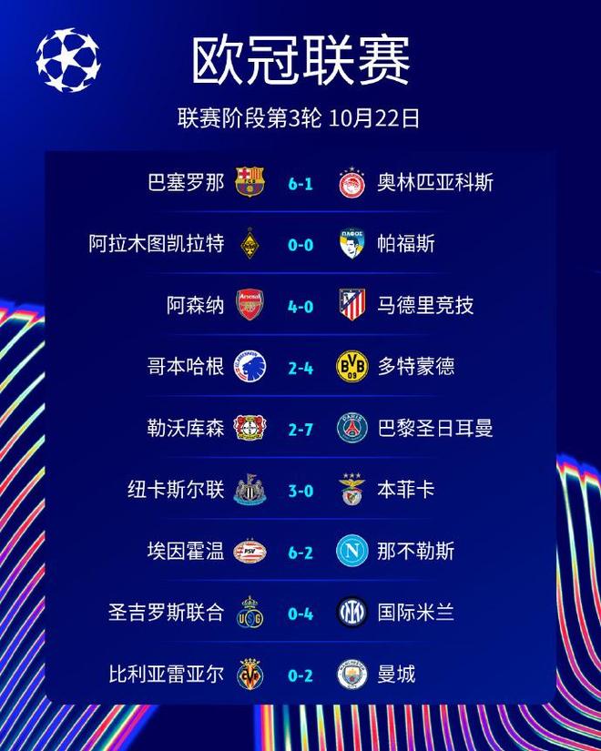 10月22日凌晨,欧冠联赛阶段第3轮第1比赛日结束9场争夺。本轮比赛上演进球狂潮,多场比赛打出高比分。巴塞罗那主场6-1大胜奥林匹亚科斯,卫冕冠军大巴黎7-2狂胜勒沃库森,埃因霍温6-2击败了那不勒斯。